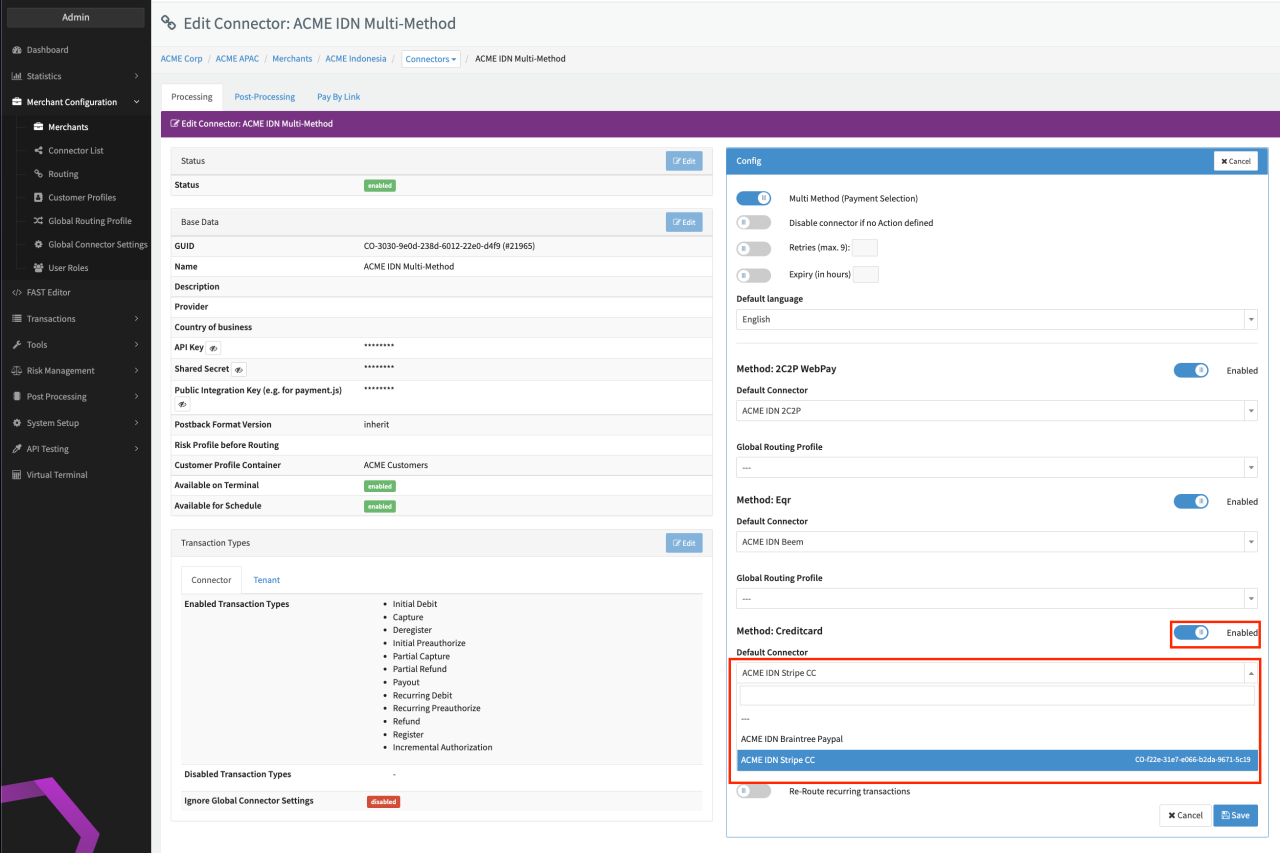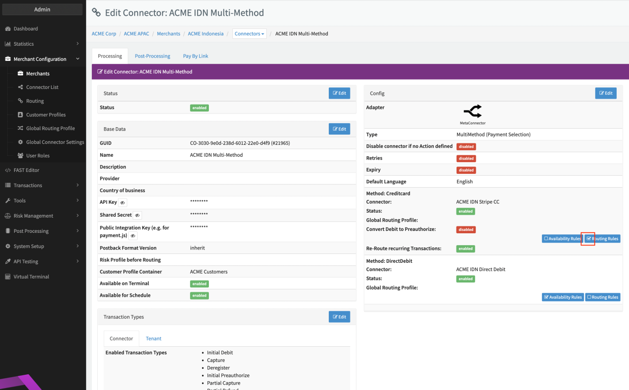 For all enabled payment methods you have the option to configure rules to define which Connector should be used. Consequently this feature is only useful in case of multiple Connectors configured for the same payment method. Follow these steps to configure Routing Rules: