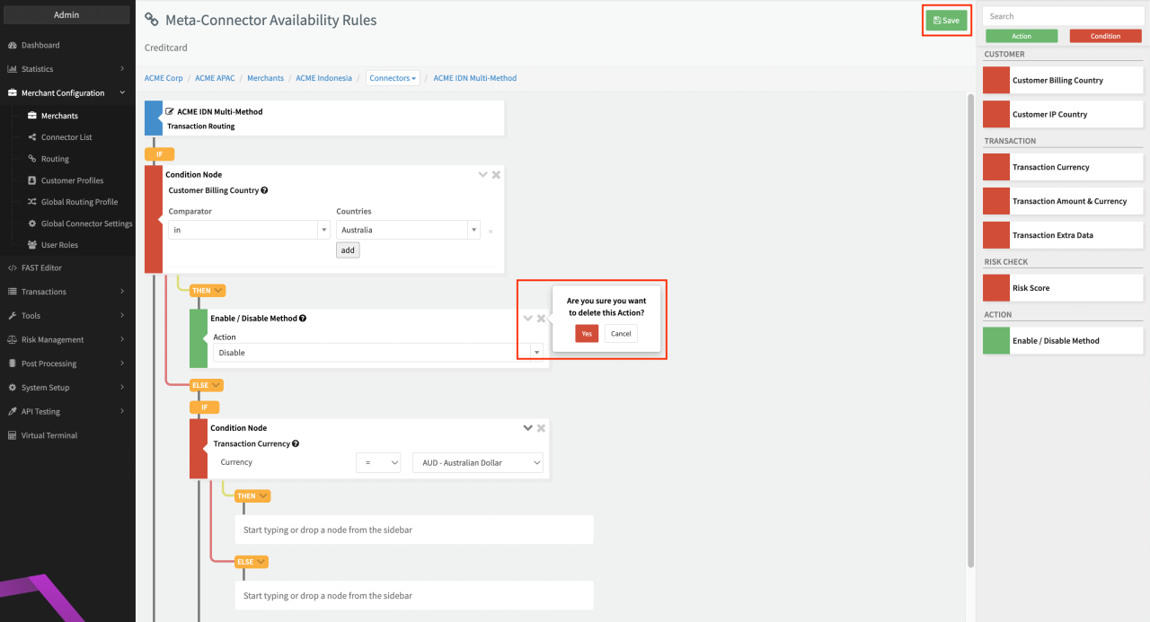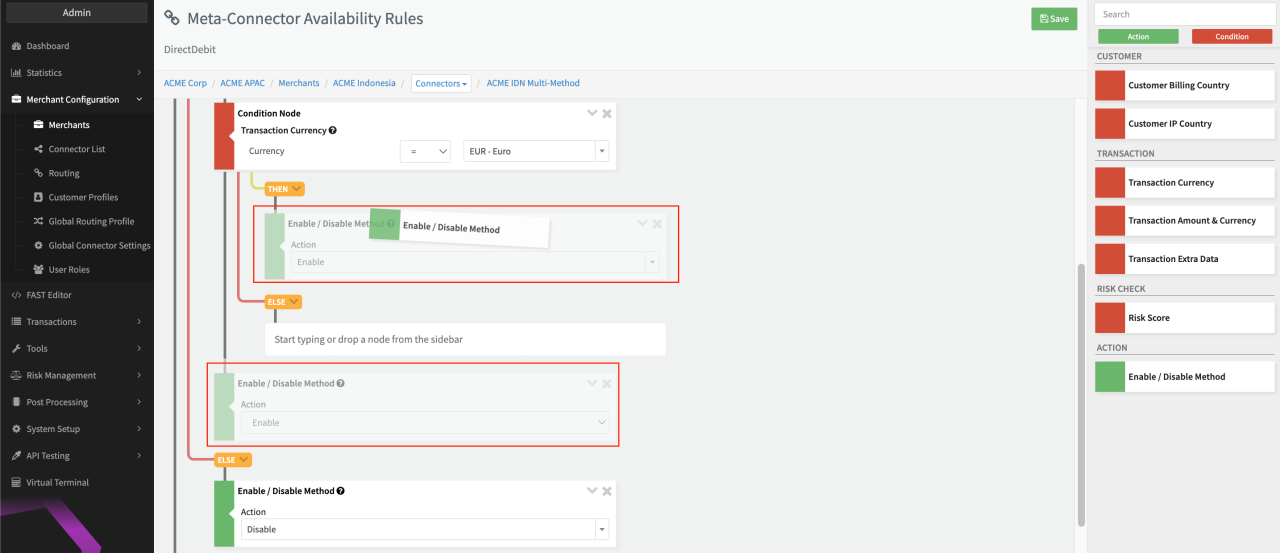 - Move the Enable Action used in the original then branch of the condition Customer Billing Country to the then branch of the condition Transaction Currency (see Moving Nodes)