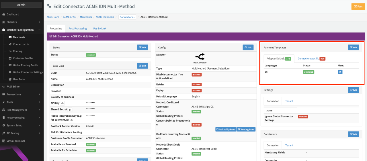 - Navigate to the Payment Template section of the Mulit-Method (Meta-) Connector (see Connector Details Overview)