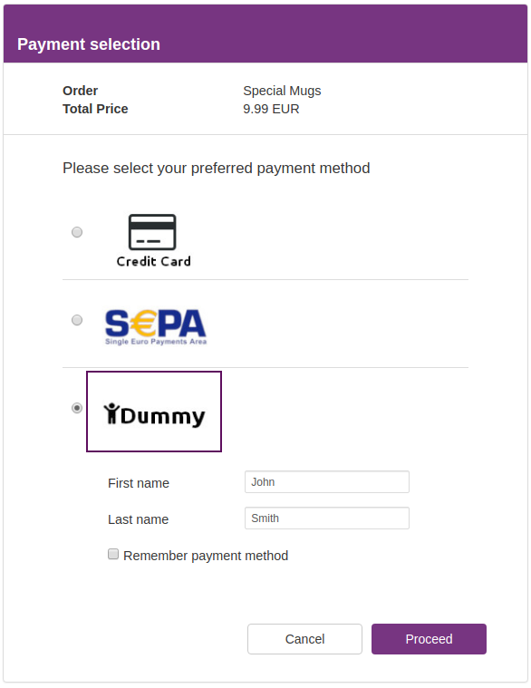 For the payment method Credit Card the uploaded creditcard.png file, for DirectDebit the directdebit.png and for Dummy the dummy.png should be used. Therefore the corresponding method and file paths need to be updated in the code snippet shown above. The available methods can be found in the configuration tab of the Connector Details Overview (see Connector Details Overview - Method names).