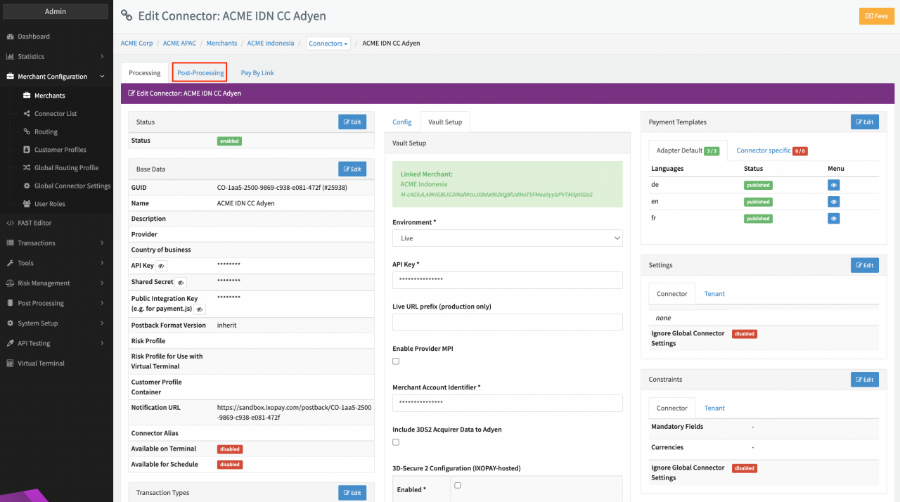 In order to perform Post Processing activities such as reconciling transaction and settlement data from Providers so called Data Fetchers need to be configured to gather the information and data from Providers. Depending on your setup and used PSPs, these data fetchers can either be set up per Connector as described below or per so called Provider entity in the IXOPAY platform. Second option having the advantage to retrieve settlements for multiple Merchants from one Provider and therefore preventing Reconciliation and Settlement Errors due to "unknown transactions" from other Merchants in one Settlement report.