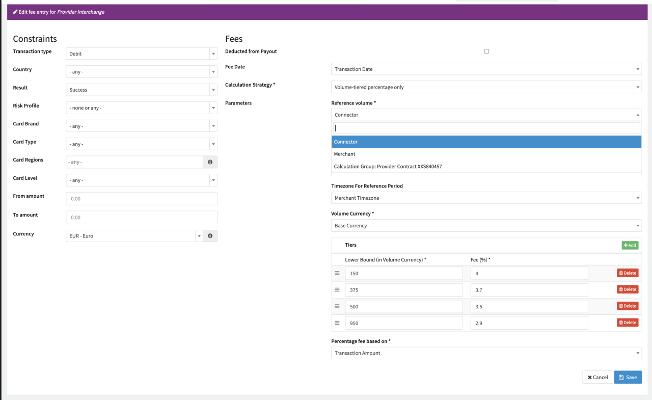 In the Post Processing tab you can define furthermore so called Calculation Groups. These Groups can then be used in for the Fee Calculation (e.g. to calculate volume-tiered/count-tiered fees over multiple merchants) as Reference Volume /Reference Count.