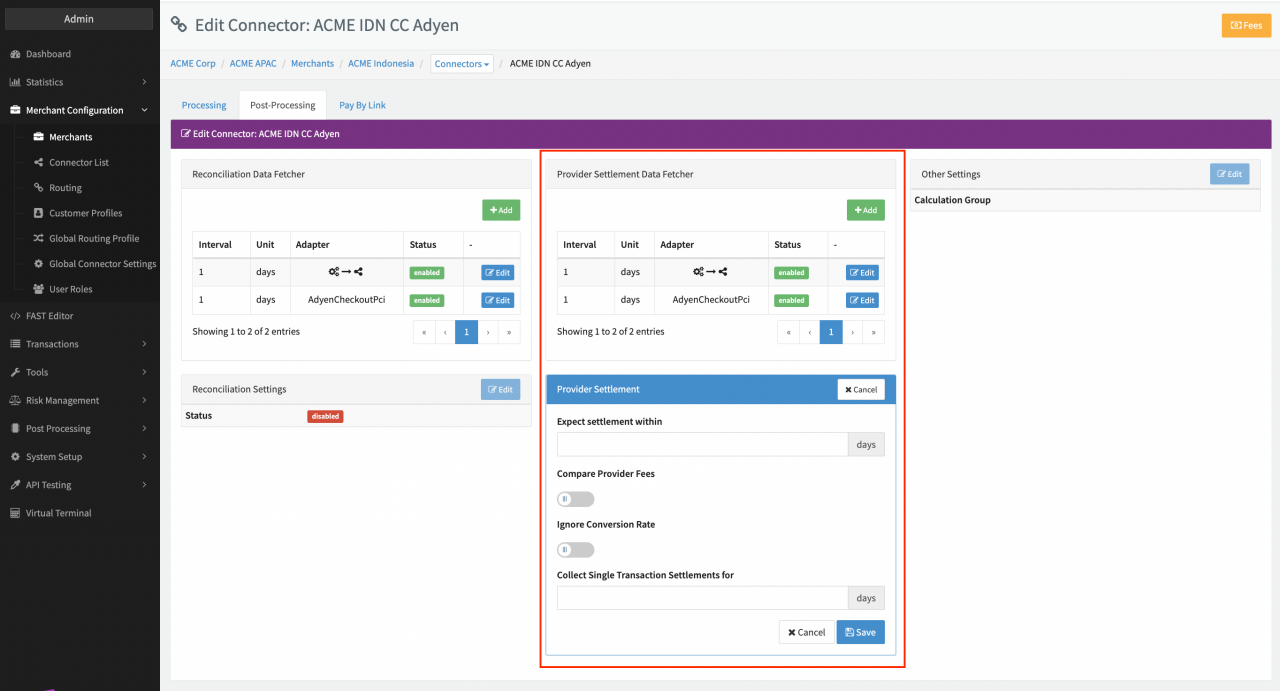 - Fill in the number of days in Expect settlement within before a Transaction will be marked as Unsettled, if no Provider Settlement is found for this transaction
