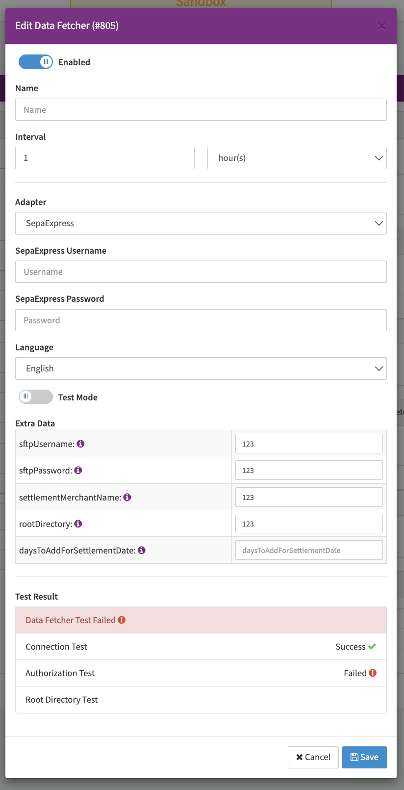 For some adapters the IXOPAY platform will automatically test the data fetcher connection after creation to verify data fetchers are set up correctly. You can see the test results in the data fetcher edit view (see Test data fetcher connection).