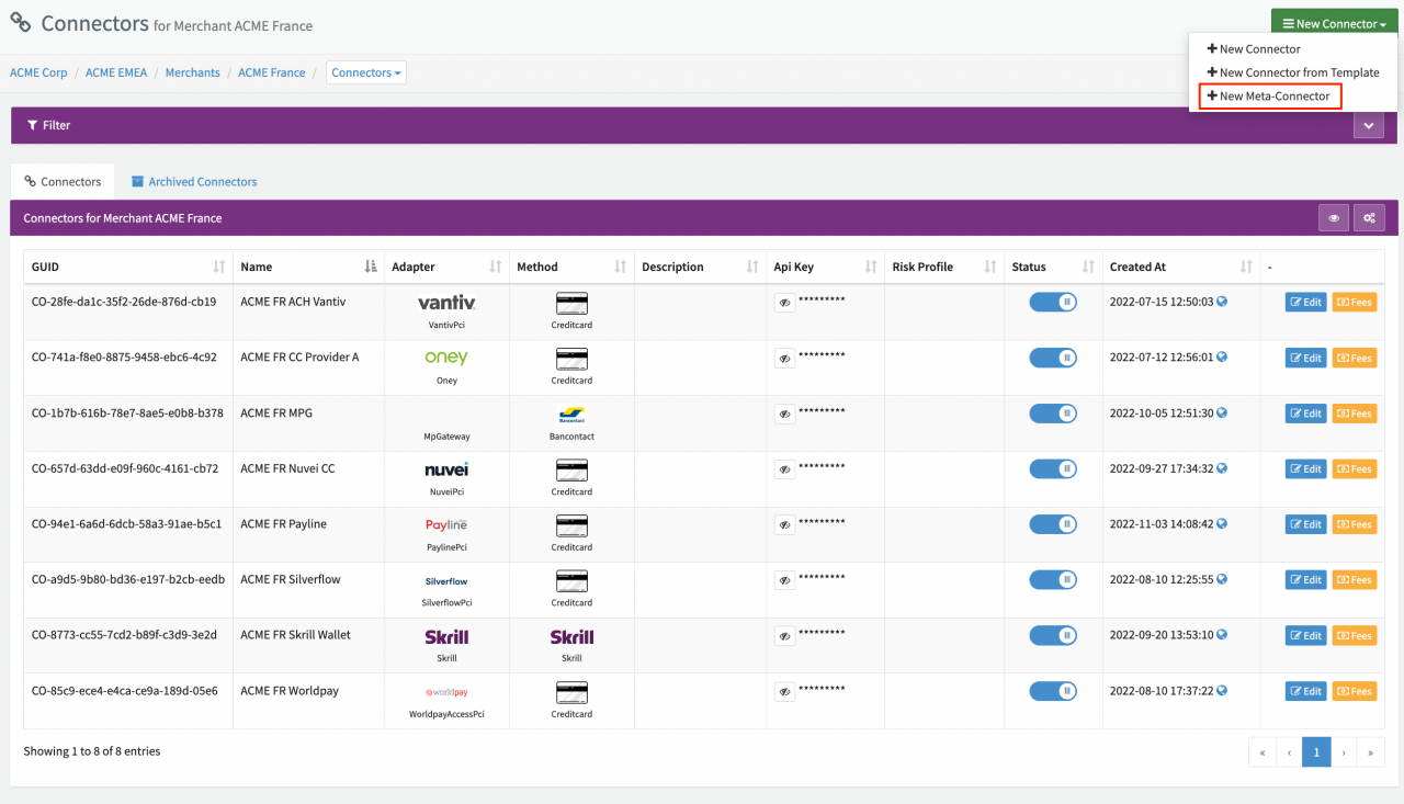 Before we get started with the Meta-Connector, it is important to note that its setup requires you to have already set up the connector you want to use for routing. The first step is therefore to create connectors for each PSP you want to use. If you already have configured your connectors, you can use those instead of creating new ones. However, it is advisable to create new connectors if you wish to use different connector configurations with the Meta-Connector.