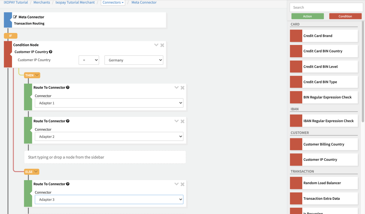 For each Condition, the transactions' card, IBAN, customer, transaction or risk data is compared with the configured rule. The outcome (either true or false) defines which path/branch (then or else) is taken. As described above, each branch can either be an Action, or another Condition. Actions do not branch further and are the final step of a branch. They determine which connector is used to process the transaction. You can configure Fallback Actions (see Rule Editor - Fallback) by adding another action directly following an action. These fallback actions will only be executed if the transaction fails with a reasonable decline code (see Fallback section).