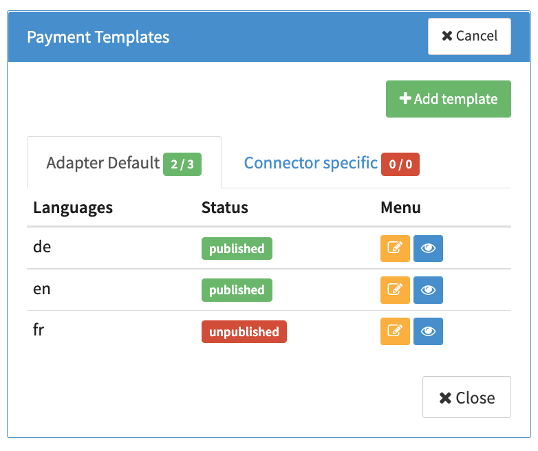Now your templates will be shown as published in the Connectors Detail Overview - Payment Templates section.