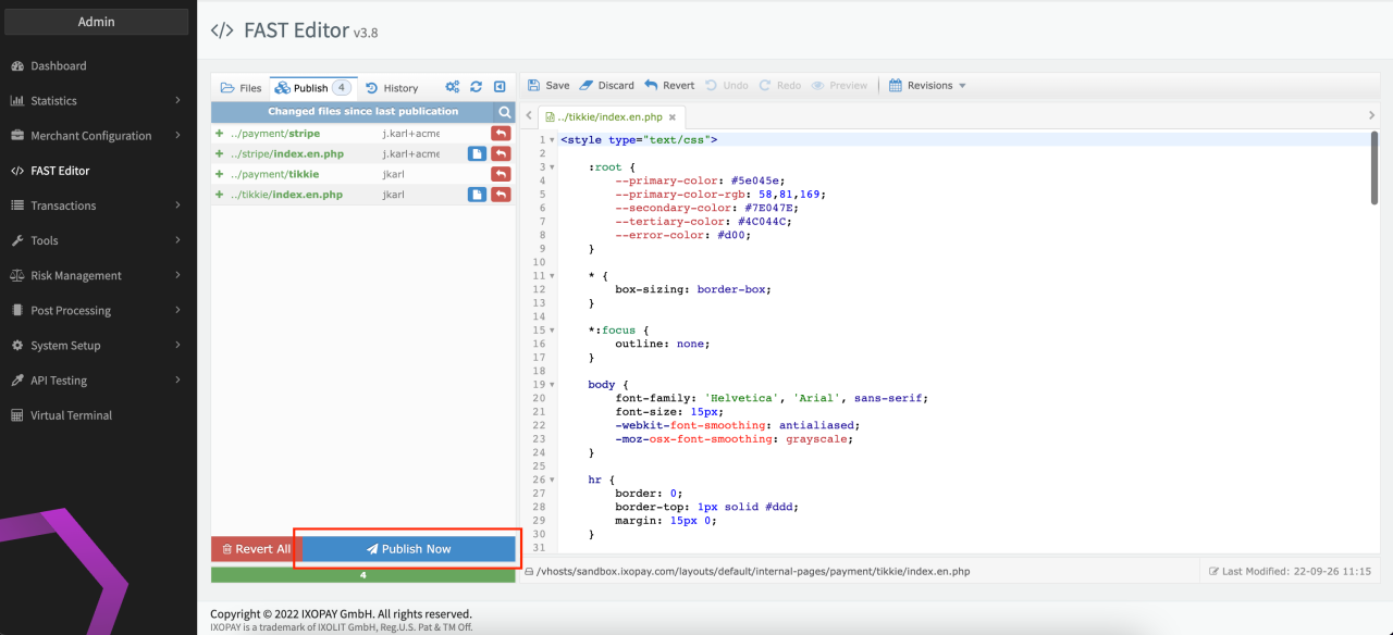 Once finished, you need to publish your changes or created templates, before they can be used. This needs to be done in Publish Section of the Fast Editor (see Fast Editor Publish)