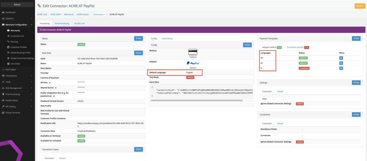 LAYOUT_NAME: You can define a Custom Payment Template Layout in the connector settings. If none is specified, the default layout is used. You can also define a layout for email templates for pay-by-link in the Pay by Link tab in the connector's configuration.ADAPTER_KEY: Each Adapter requires its own templates. The available placeholders differ for each adapter.LANGUAGE: The merchant can include the desired language in the API call (see the Transaction API Documentation). If a template does not exist for the specified language, the default language defined in the connector's configuration is used instead. Languages are specified using 2-letter ISO codes, e.g. "en" for English, "de" for German, "es" for Spanish etc.