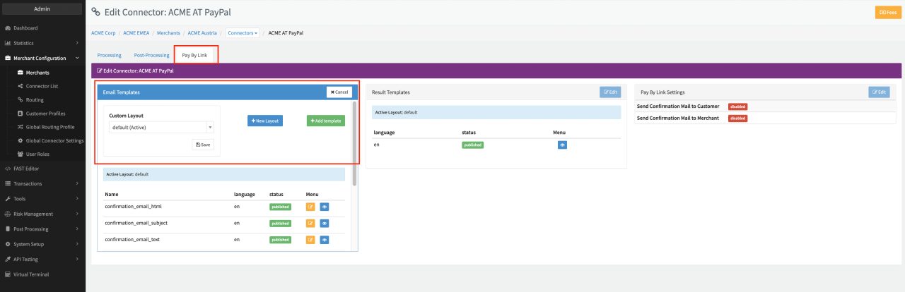 template layout in the Pay by Link section), you can set up various templates based on different requirements for your