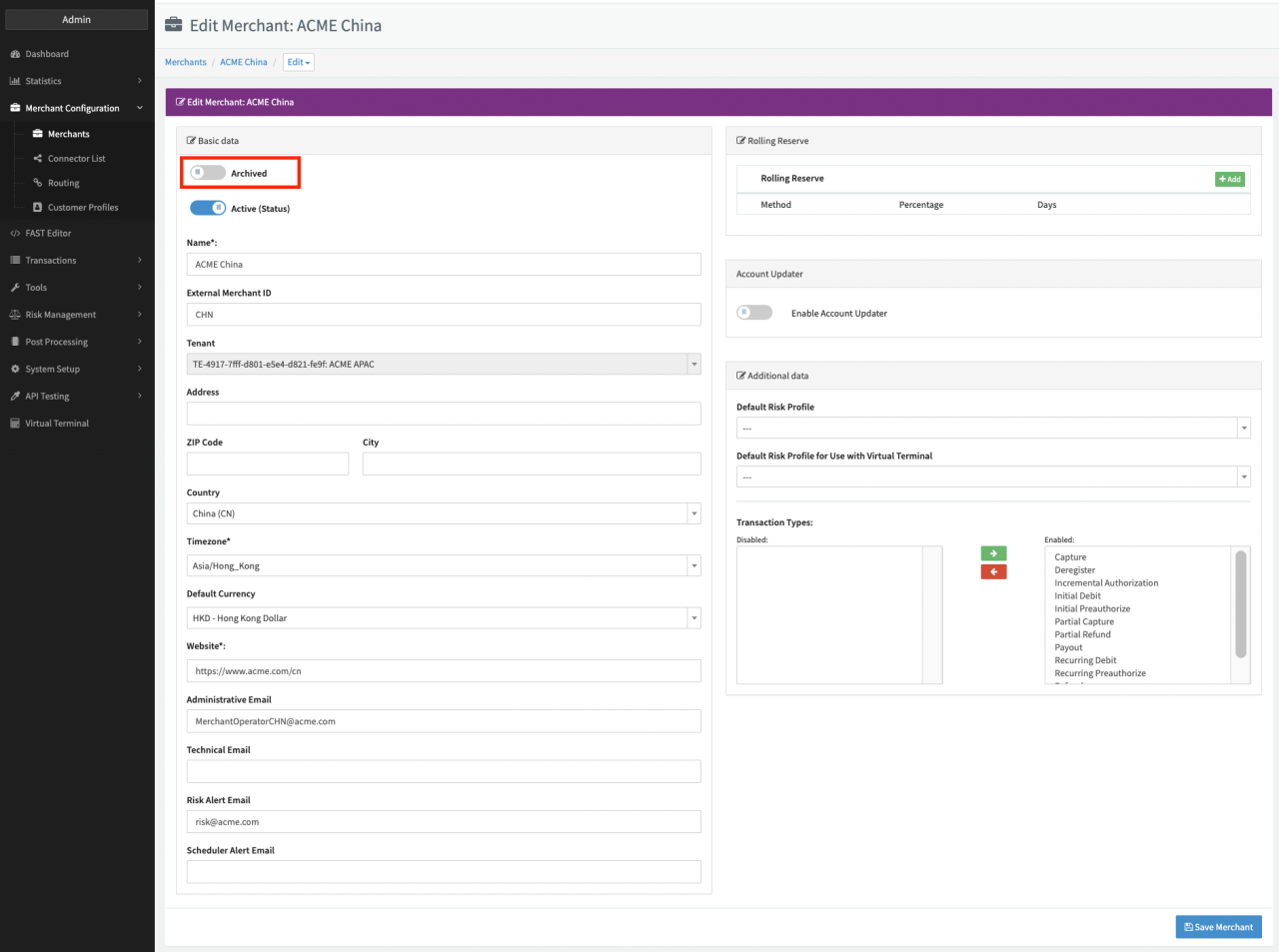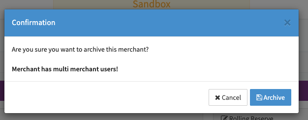 Once a Merchant is archived all of his associated configuration elements such as Connectors, Users, Templates are also archived. After archiving you still have the option to un-archive a Merchant.