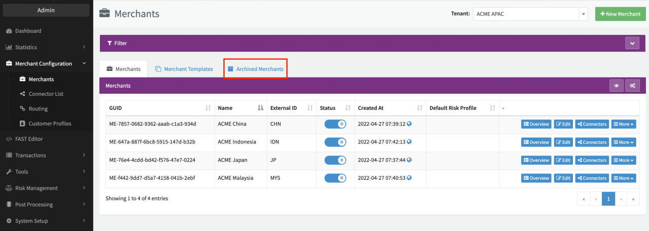 If the feature is enabled, you will find an Archived Merchants Tab in the Global Merchants Overview.