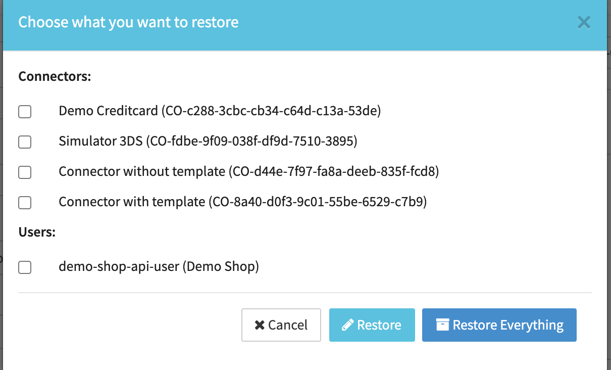 - Each component archived under the Merchant can be selected or deselected individually for unarchiving along with the Merchant, or the user can restore all components instead.