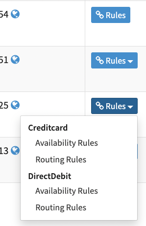 In the Connector List you have the option to directly edit the Connector Settings, Fees or the Rules see also Multi-Method Connector and Meta-Connector section by using the Action Buttons (see Filter Result). Click on the Rules Button for Meta-Connectors to be redirected to the Rule Editor. For Multi-Method Connectors select from the drop-down which Rules you want to edit, before being redirected to the Rule Editor (see Connector List Edit).