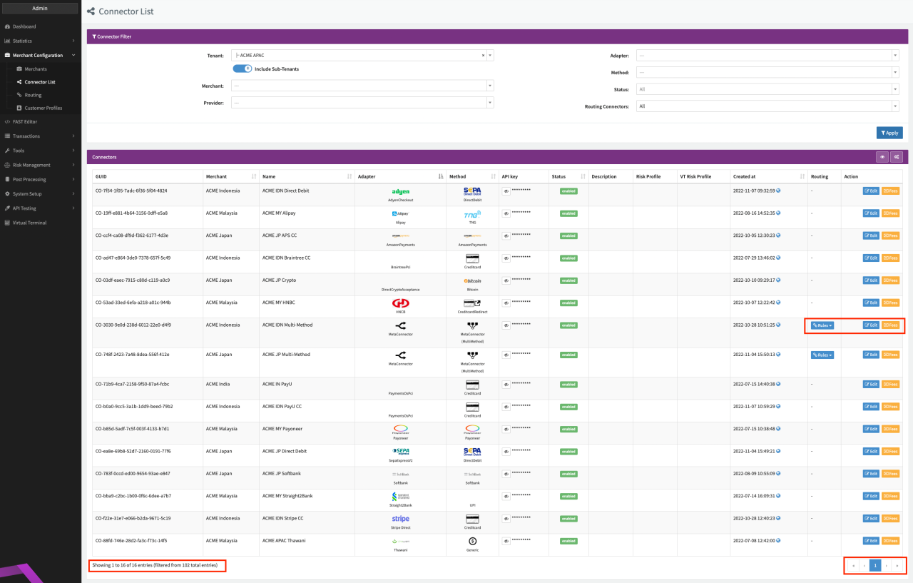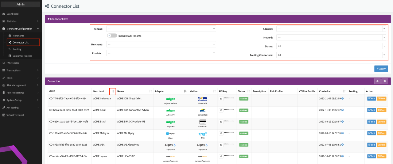 At some point during your IXOPAY journey, you may have many different connectors distributed across different (Sub-)Tenants and Merchants. To get an overview of your Connector Setup and to filter and find specific Connectors, you may use the Connector List.