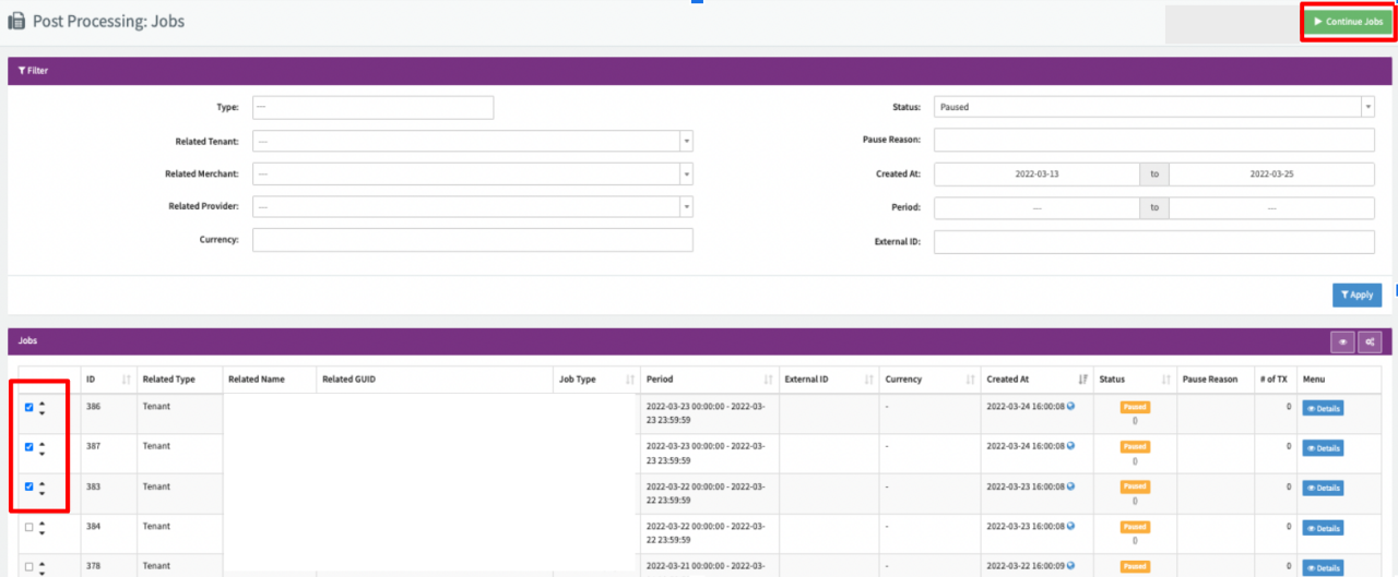- Bulk continue all paused jobs with the multi-selection option (see Bulk Continue) or