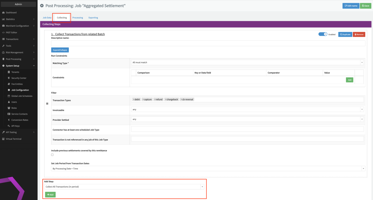 | Collect Transactions from related batch | For Jobs that were triggered based on Provider settlements (see Job Schedule section), this step collects all Transactions, that were included within the Provider settlement triggering this job. With the Filter section you can define additional criteria to filter the collected and therefore considered Transactions for further job steps. The option Set Job period from Transaction dates sets the job period automatically based on the included settled Transactions |