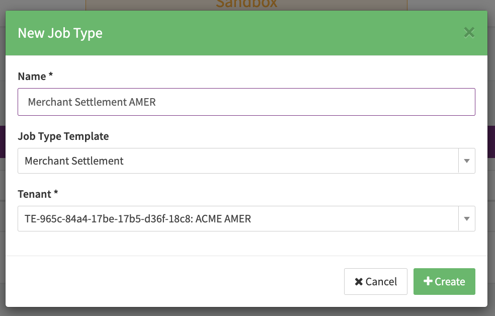 - Fill in the Job Type Name and "owning" (Sub-)Tenant and click + Create (see Create new Job Type)
