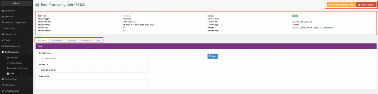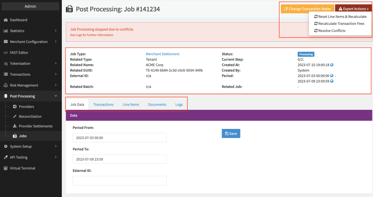 - Expert Actions: Reset Line Items & Recalculate, Recalculate Transaction Fees, Resolve Conflicts