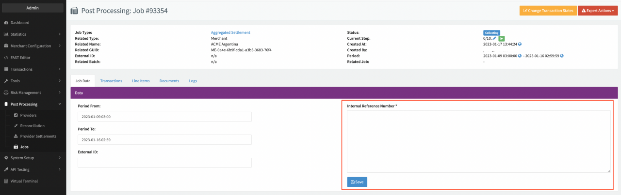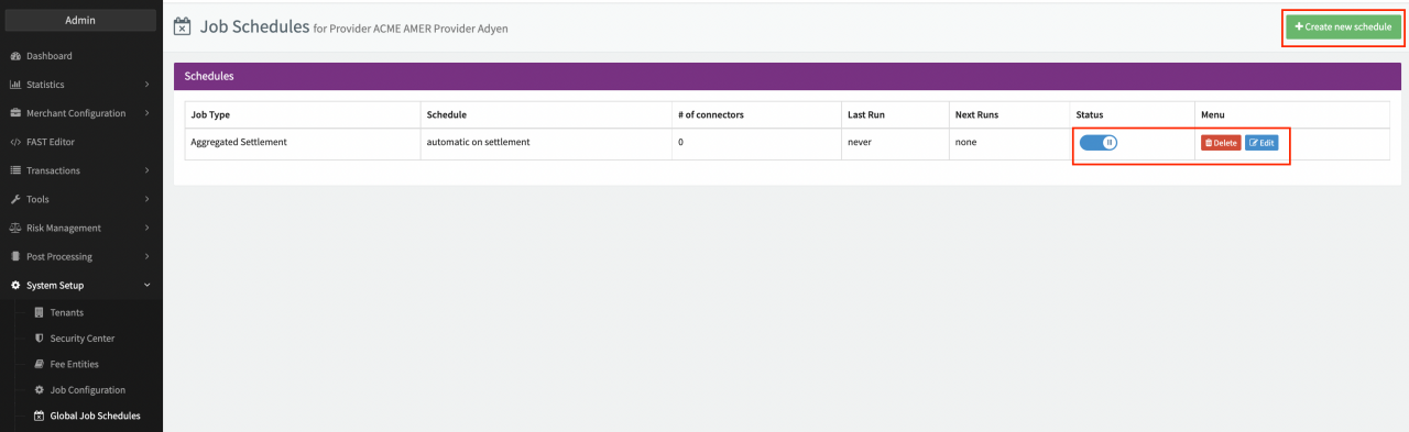 Once a job type is configured, you must schedule this job on the designated related entity so the job "knows" which scope of Transactions shall be considered for processing. The related entity can either be a Merchant, a Provider, or a Tenant: