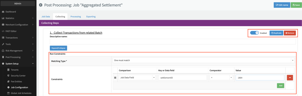- Enable/Disable step: Disabled steps will not be considered in executed Post Processing Jobs