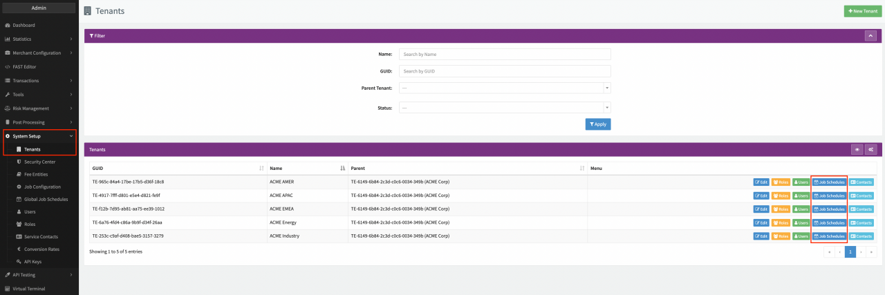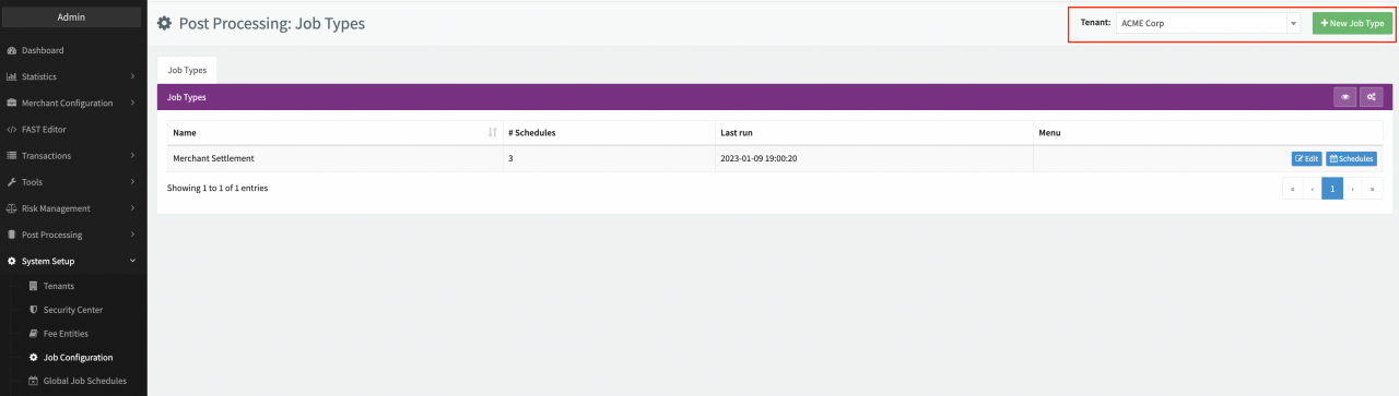 Job Types can only be scheduled on entities within the hierarchy of the entity the Job Type was configured for: E.g. Job Type is defined for Tenant ACME Corp. The Job Type can only be scheduled on Sub-Tenants, Provider, Merchants created under the ACME Corp tenant.