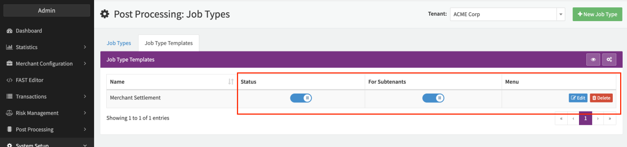 With the Permission postprocessing.job-config.templates.* Job Type Templates can be created and found in the Job Type Templates Tab where they can be made available for Sub-Tenants, enabled /disabled, edited or deleted.