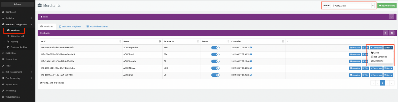 - Merchant: Navigate to the Merchant Overview, select the (Sub-)Tenant for which the desired Merchant is configured and click Job Schedules from the More drop-down of the desired Merchant