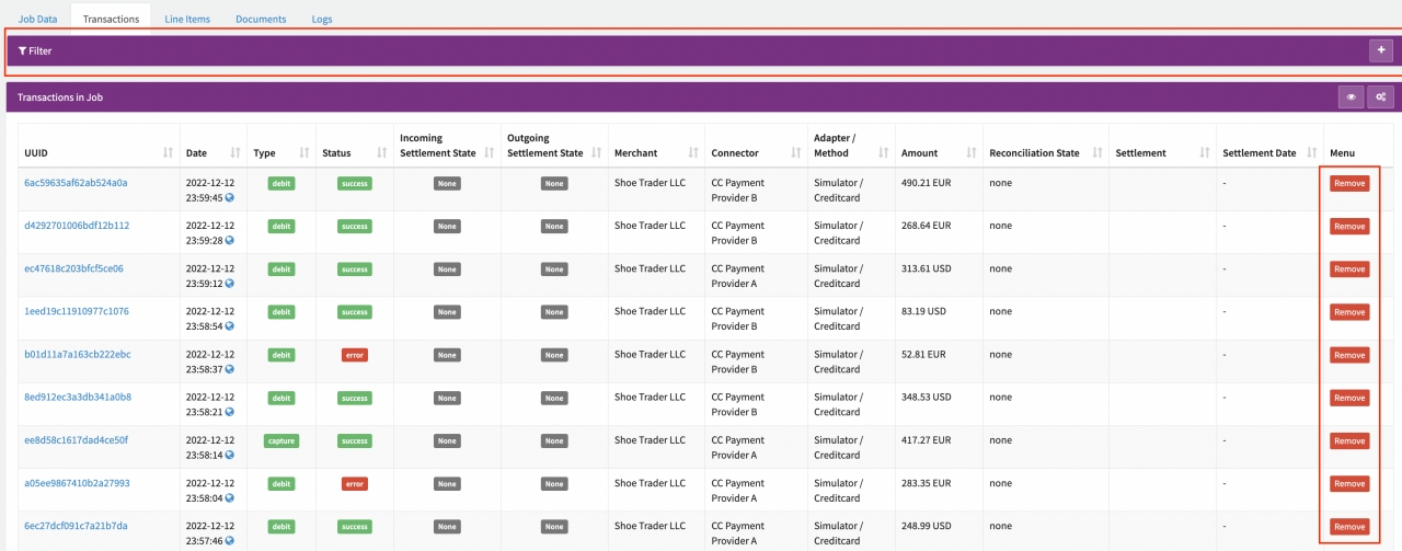 This tab contains the collected Transactions from the Job Types configured Collecting steps. You can filter the Transaction list and remove Transactions if necessary before continuing a paused Job (see Transaction Tab).