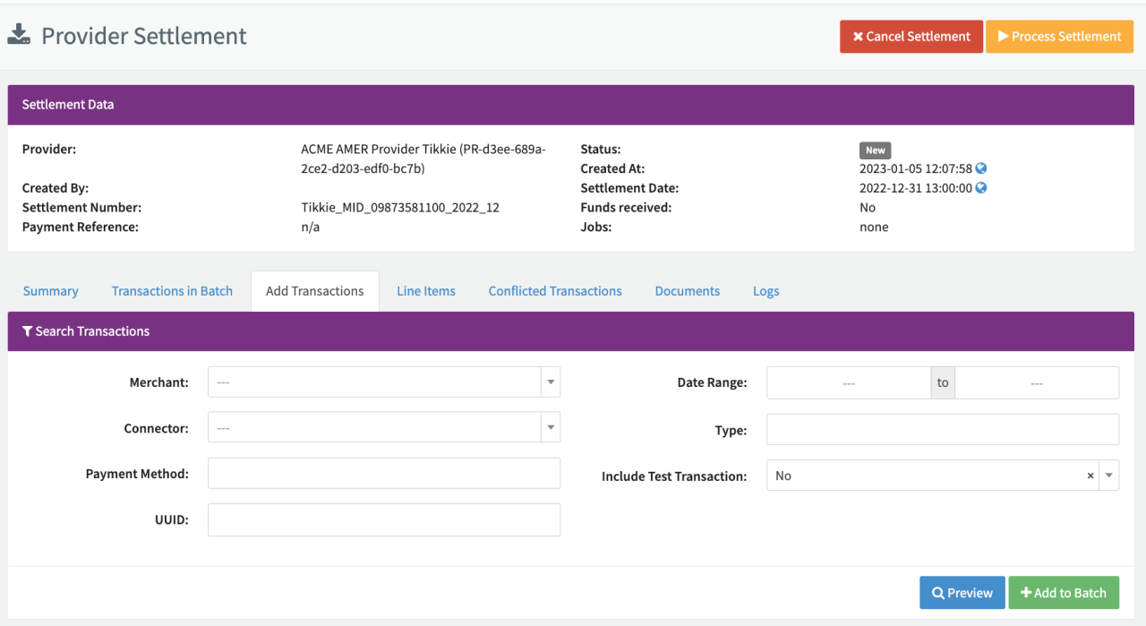 - Switch to the Add Transactions tab to add transactions to the settlement. Use the filters to search for the transactions you want to add to the batch. Click on Preview to view all matching transactions.