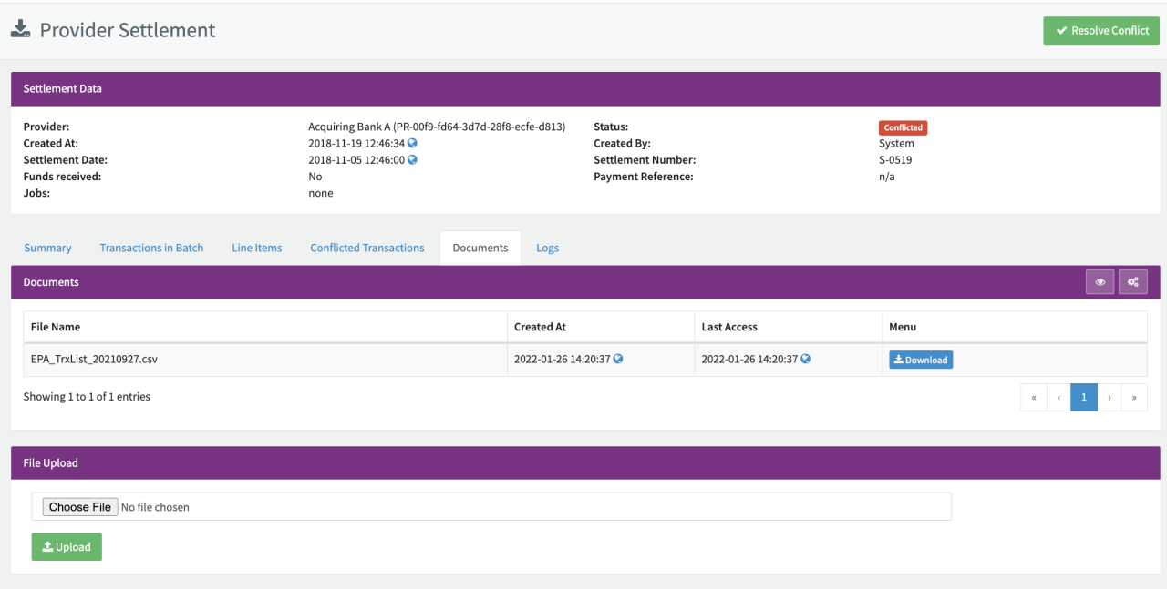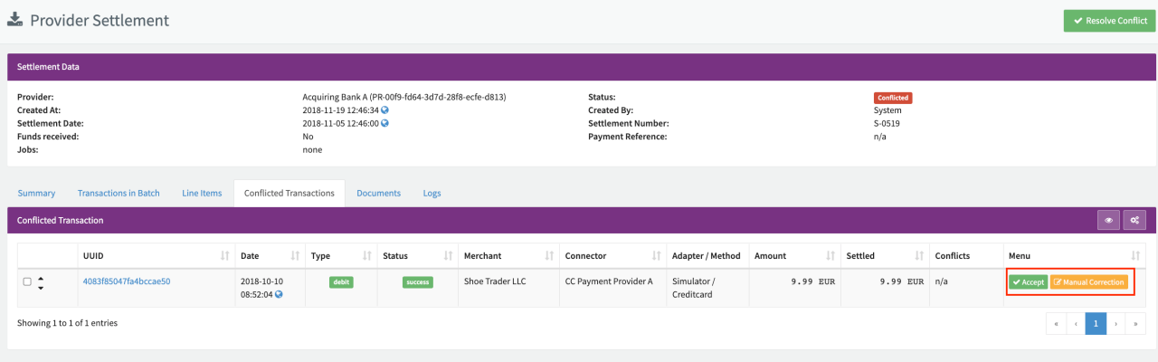 - Conflicted: There is at least one transaction where the settlement amount/currency, fees or conversion rate does not match the expected values