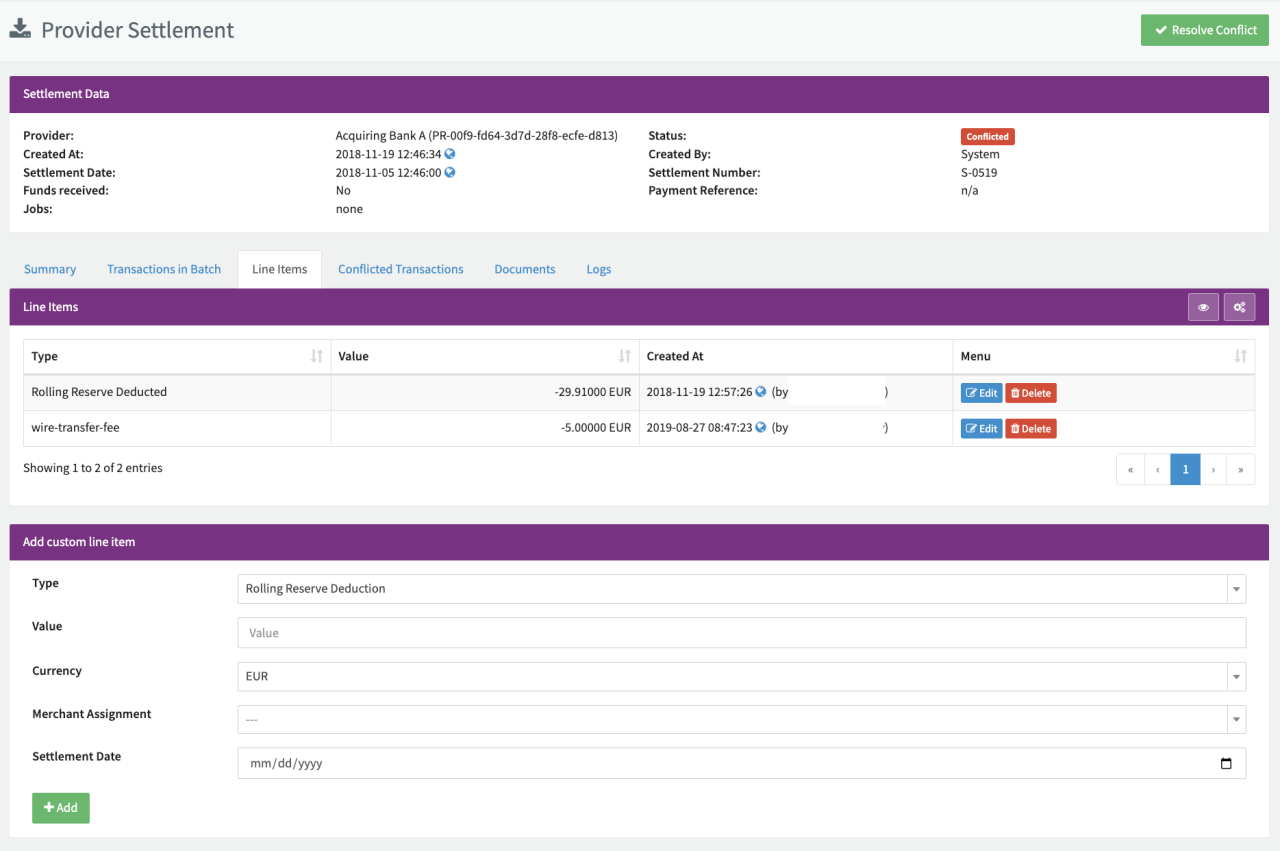 - Line Items: Overview of created custom/non-transaction related line items (e.g. rolling reserve/reimbursement, adjustments, fines, informational items like gross settlement, net settlement) with options to edit, delete existing Line Items and/or create new custom Line Items (see Line Items screenshot).
