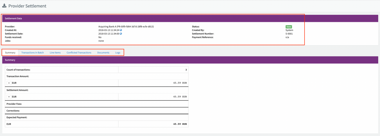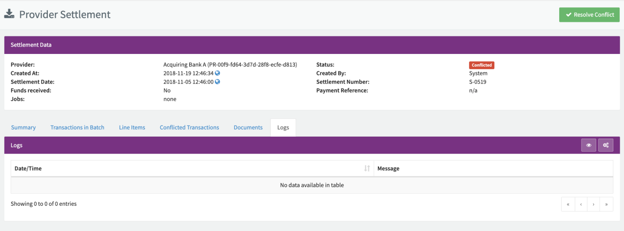 - Logs: Provider settlement logs contain information about items in the settlement statement/file that could not be processed (e.g. transactions that could not be resolved, see Logs screenshot)
