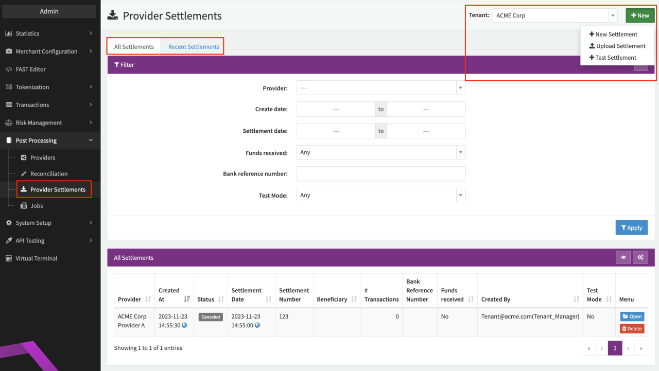 - Navigate to the Post Processing section, sub-section Provider Settlements. Any settlements retrieved from your providers are listed here.