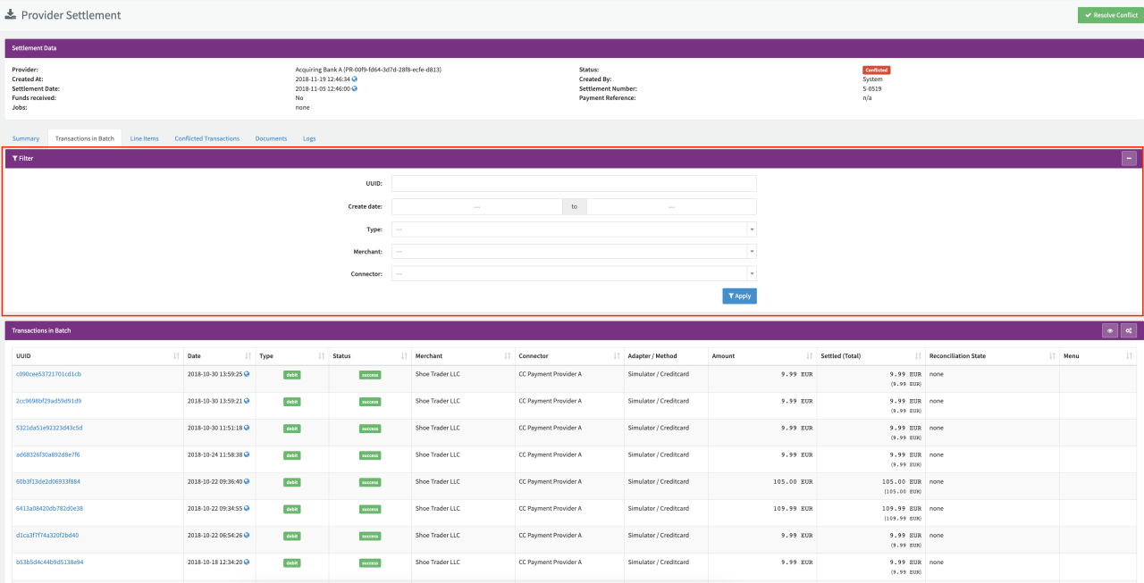 - Transactions in Batch: Overview of all transactions included in the provider settlement batch (filter options are available). A transaction might be included in multiple settlements. For each settlement, the IXOPAY platform stores the individual amount, the cumulative amounts are the total settlement amount.