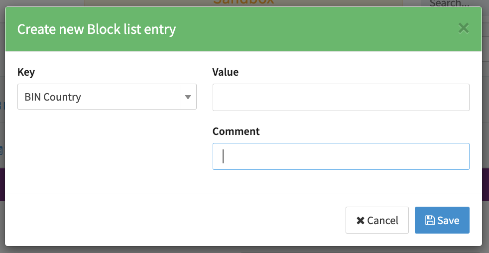 - Select a Key to determine what type of information should be added to the list (see Add entry screenshot). You can select from the following: BIC, BIN Range, Billing Country, CC Fingerprint, Customer Identification, Email, First Name, IBAN, IP Country, IPv4 Address, Last Name, Shipping Country, Billing Phone Number and Shipping Phone Number.