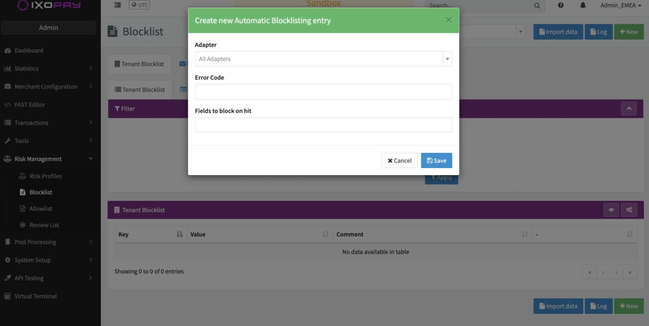 - Select an Adapter if you want to add entries to the blocklist based on the error code / merchant advice code received from an adapter. Leave this blank if you want to use the IXOPAY platform error codes.