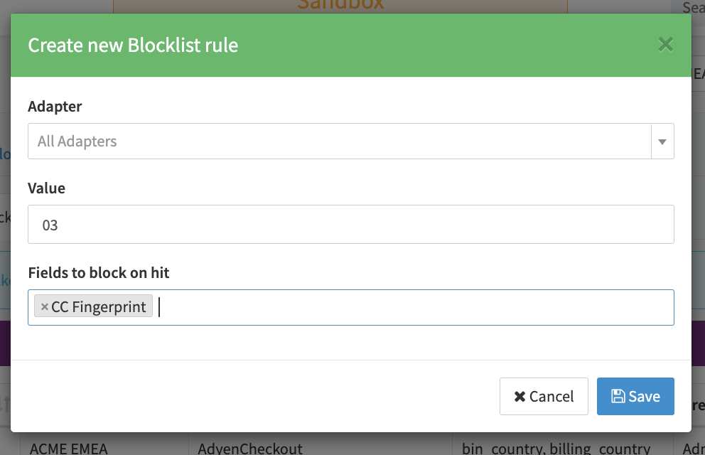 - Select the Fields to block on hit to determine what keys and values should be added to the blocklist. (Note: CC Fingerprint applies to both, Global and Merchant CC Fingerprint, and will put 2 entries on the related Blocklist)