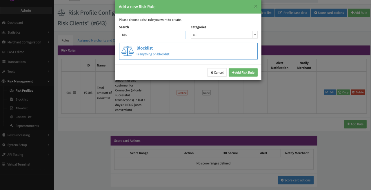 - Assign your new blocklist or allowlist to a risk profile as a risk rule (see Assign Blocklist to Risk Profile screenshot). For more details, refer to Risk Profile and Risk Rules.