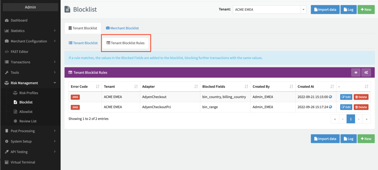 - You can define blocklists and allowlists at the merchant level or for a (sub-)tenant.