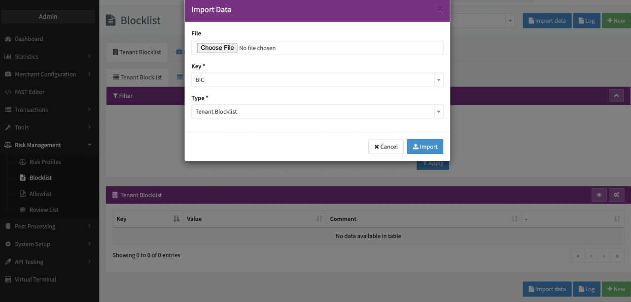 - Chose the type of blocklist/allowlist the values should be imported to (merchant, tenant or global).
