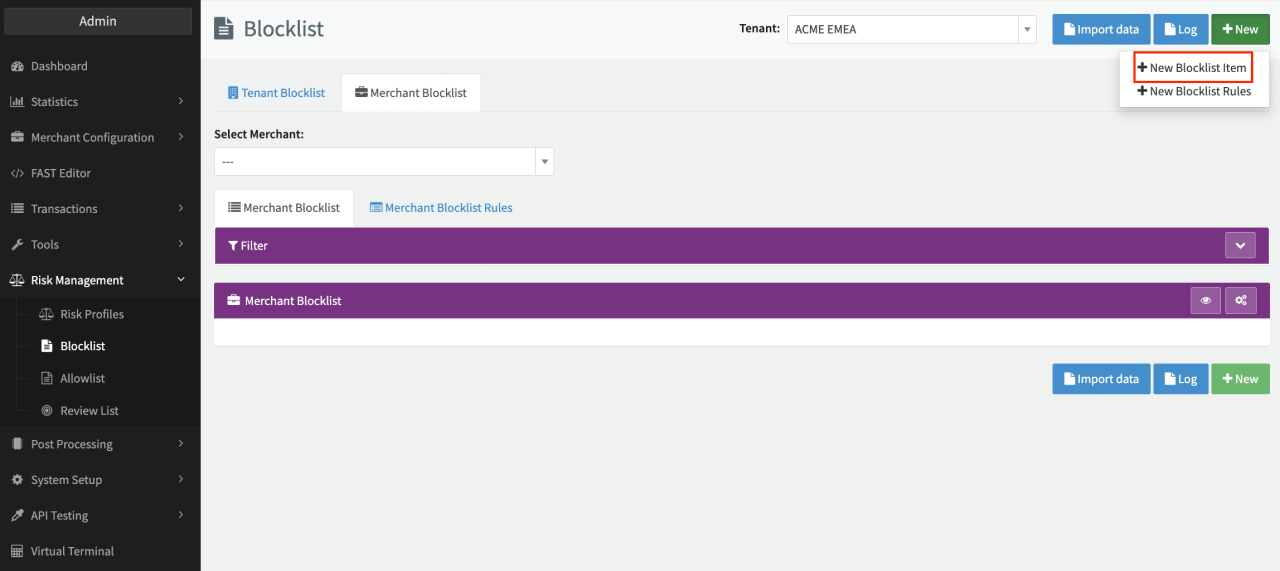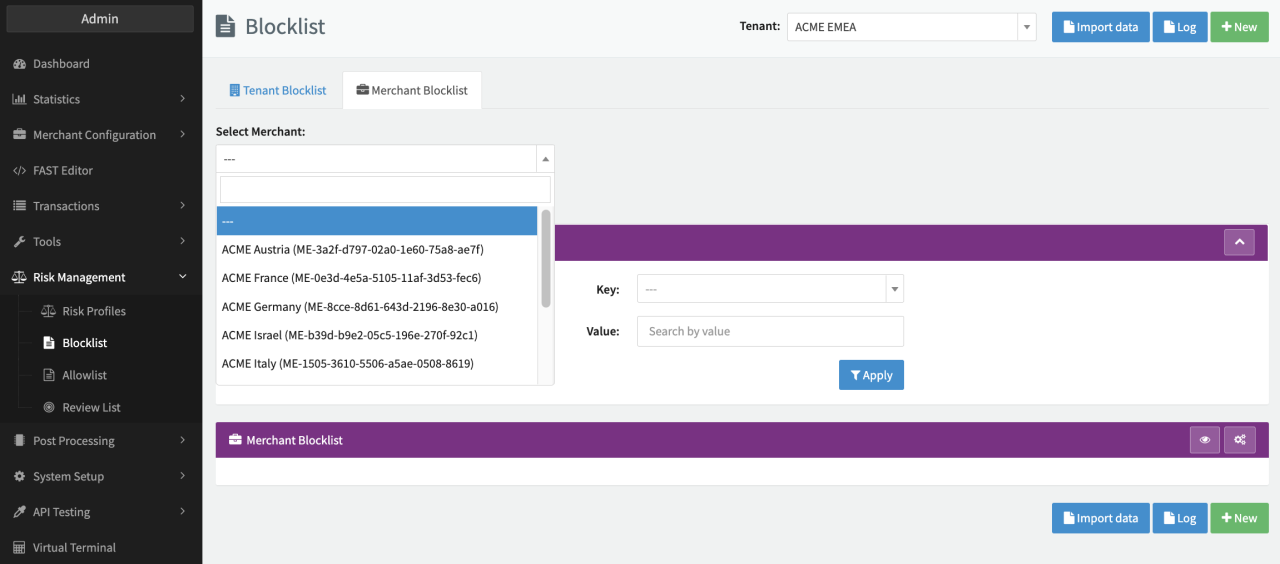 - Switch to the Merchant Blocklist/Allowlist tab and select a merchant (see Merchant Selection) to define a list at the merchant level.
