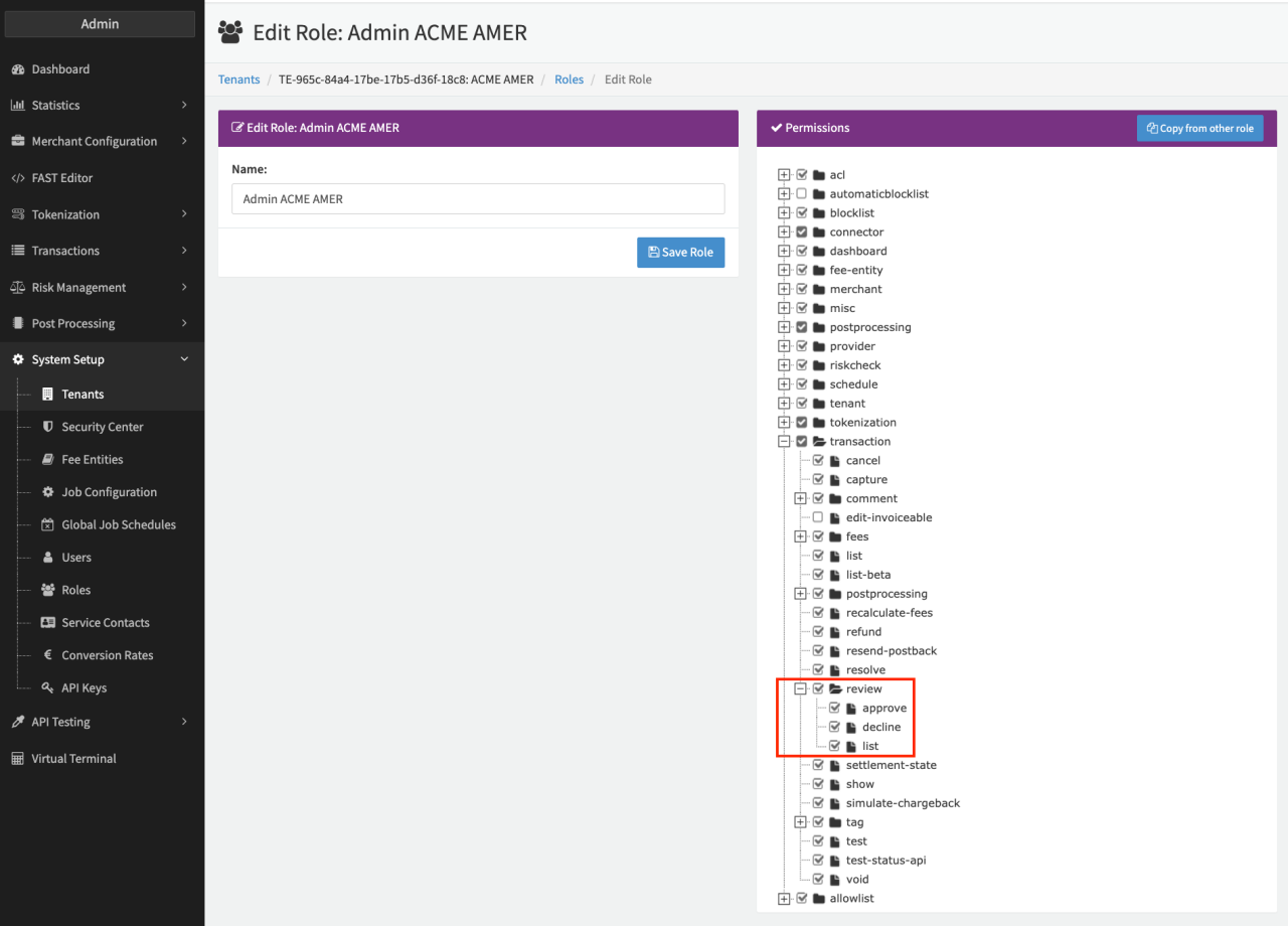 To be able to setup the feature, the permissions transaction.review.* must be enabled for your tenant and activated for your Admin User Role (see Permissions Admin User).