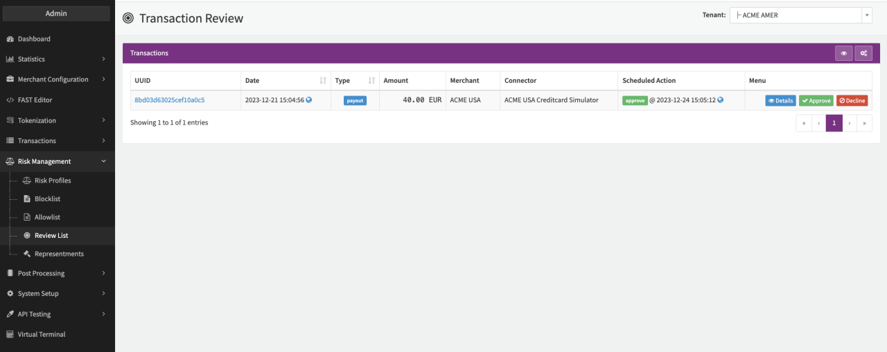 The transaction will show up in the review list (see Review List & Transaction Details) where the configured roles or users can confirm the payout (see Approval).