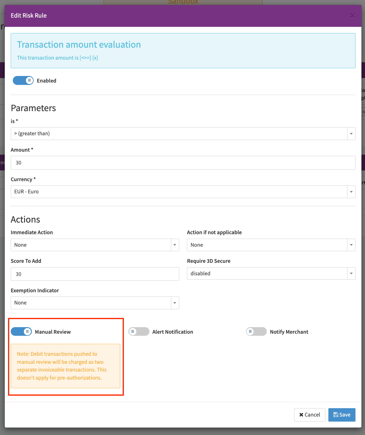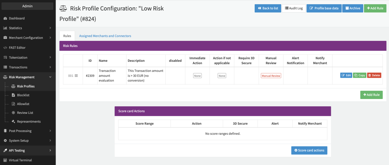 In this example, we will use the risk rule Transaction amount evaluation to manually review every payout transaction with a value higher than EUR 30 (see Risk Rule & Risk Profile).