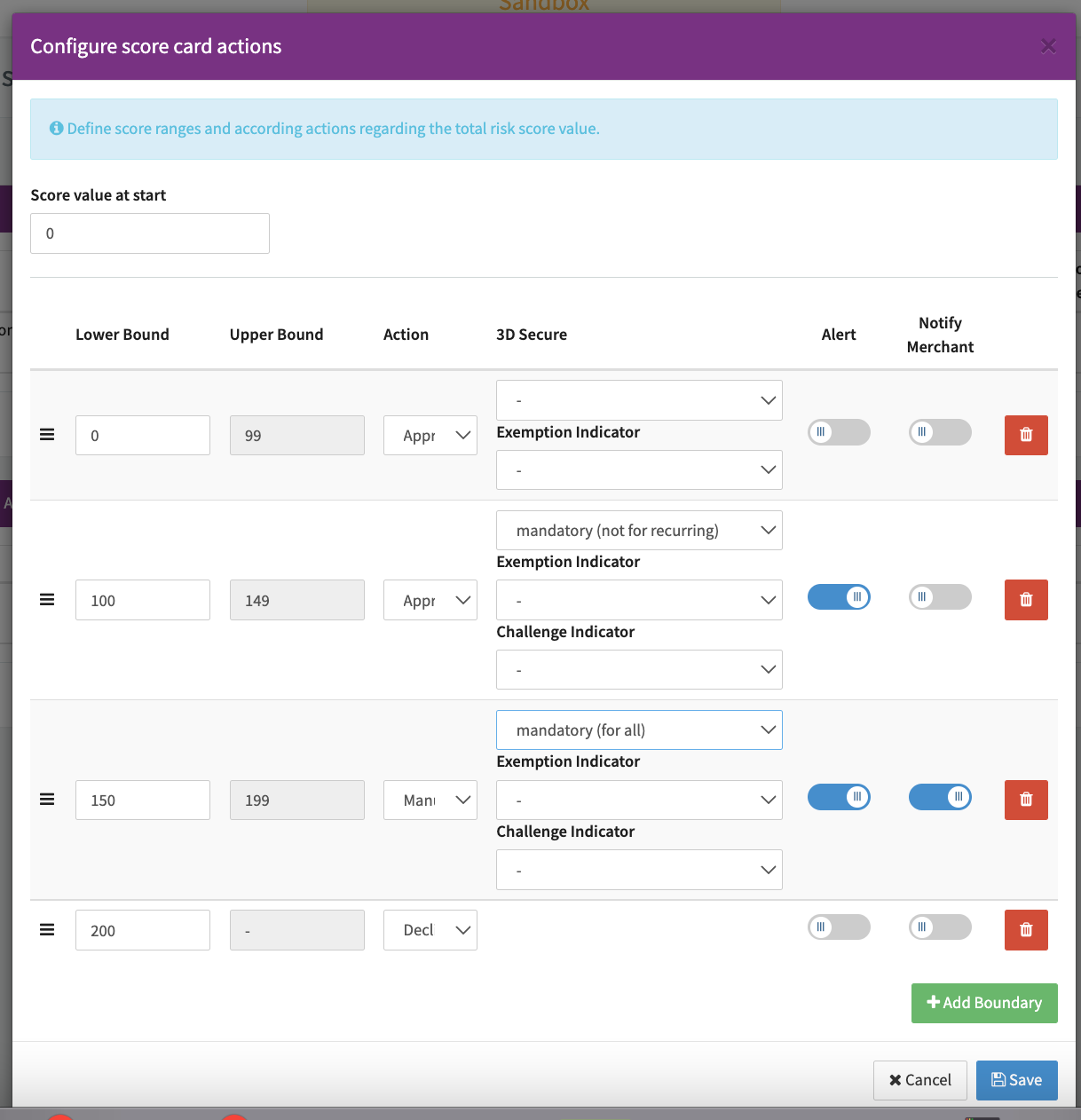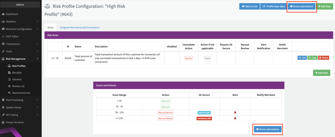 You can define score card actions for each risk profile to trigger specific actions based on the risk score assigned to the transaction. You can approve or decline transactions, apply (additional) 3D Secure requirements, require a manual review transaction or send alerts. The total score of the transaction after all risk rules have been checked against the transaction determines what action is triggered, and you can define different actions for different score ranges.