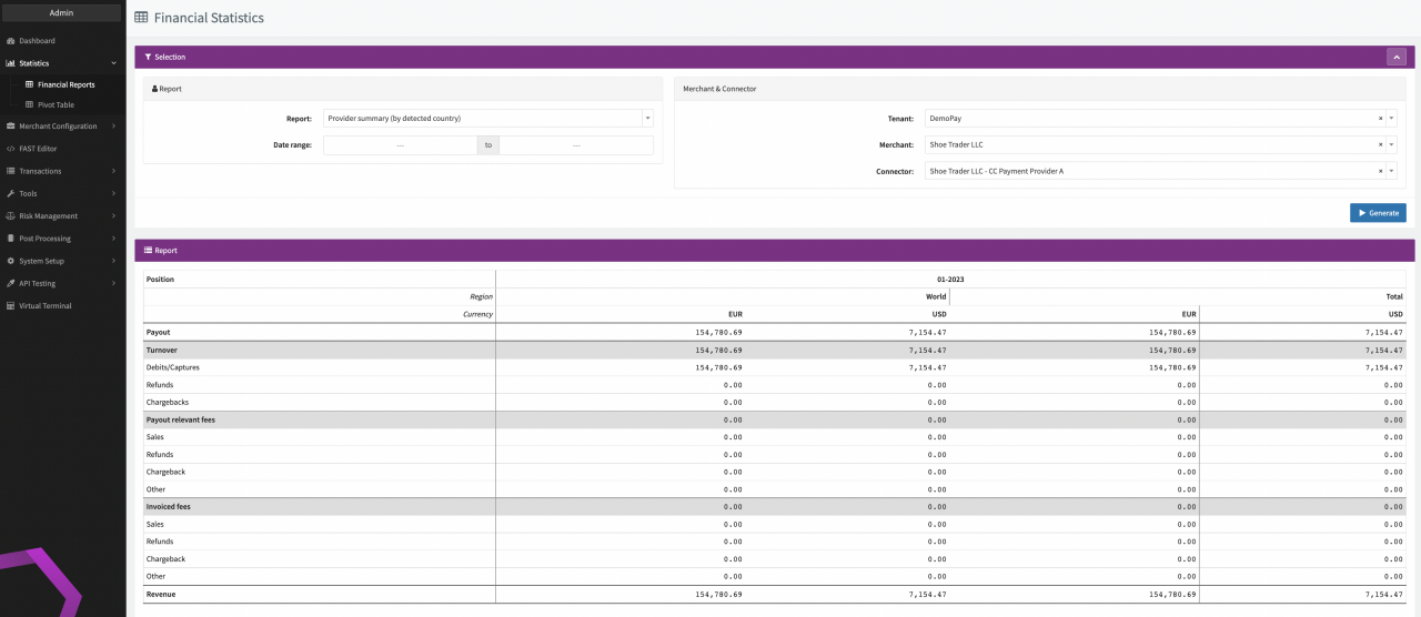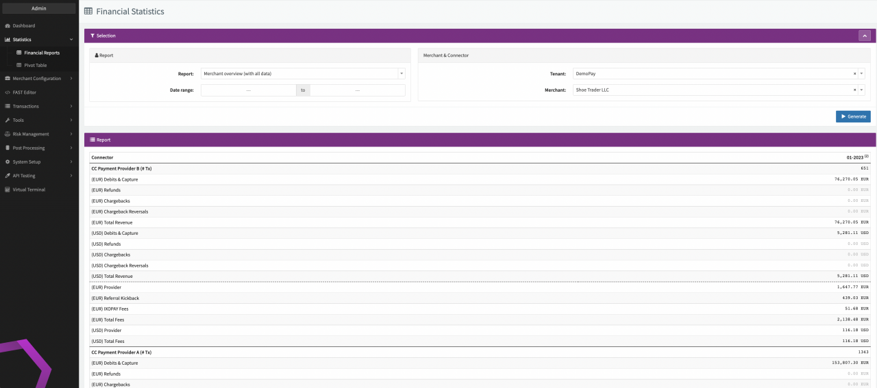 The Statistics section provides you with options to generate extensive Financial Reports and Pivot Tables directly in the IXOPAY platform.