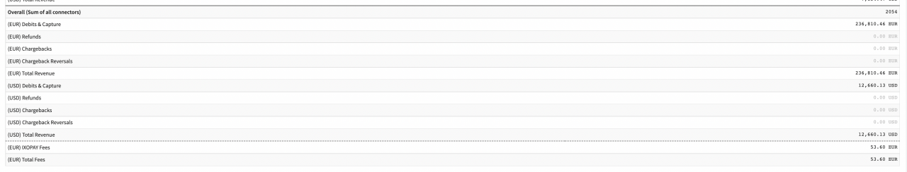 - Merchant Overview either from Merchant perspective or with all data: provides information about total Transaction Volume and Fees (only if Fee Entity is marked as Merchant Visible) of the Merchant (see Merchant Overview) including the Overall (Sum of all Connectors) Volume at the bottom of the report.