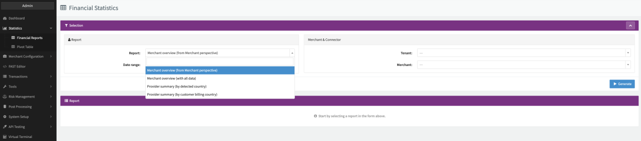 - Select a Tenant, Merchant and Connector for which the report should be generated.