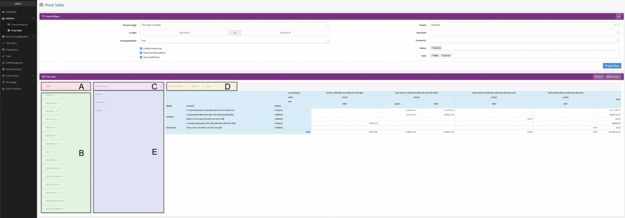 - Pivot Table Lines/Columns variable: Drag & drop variables from the list (Section B the Pivot Table Customization screenshot) to section D or E (see Pivot Table Customization screenshot) to add variables as columns or rows respectively. Determine the order in which variables are displayed in the pivot table by dragging them to the desired position, indicated by a box with a dashed outline. The following variables are available: tenantName, merchantName, providerName, adapter, connector, metaConnector, method, type, isRecurring, status, status simplified, currency. baseAmount, feesCurrency, feesEntity, feesDeductsPayout, year, binBrand, binCountry, binLevel, binType
